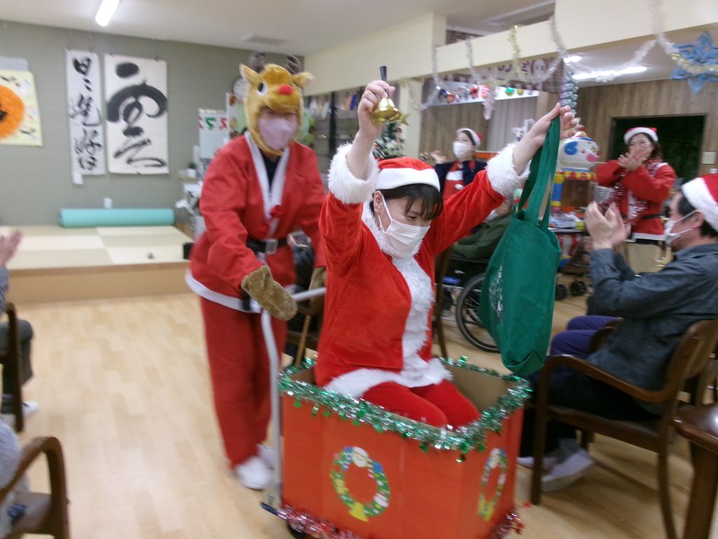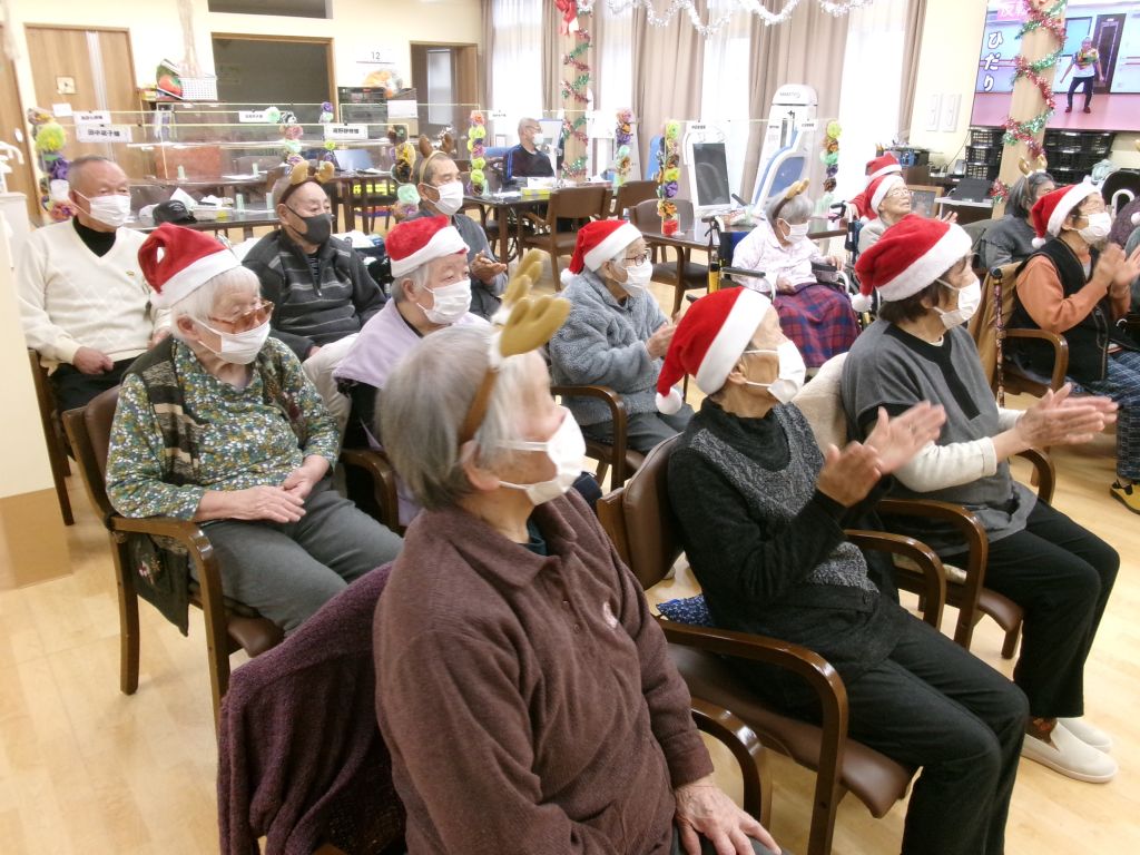 皆さんで歌を歌ったり、職員の出し物やクリスマス版・特別レクリエーションを行い
